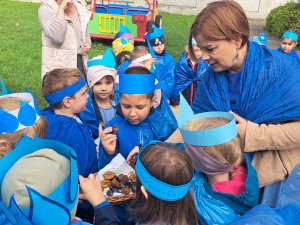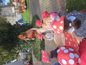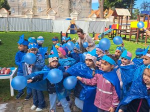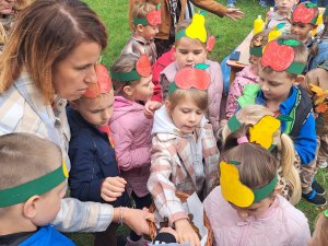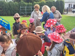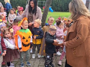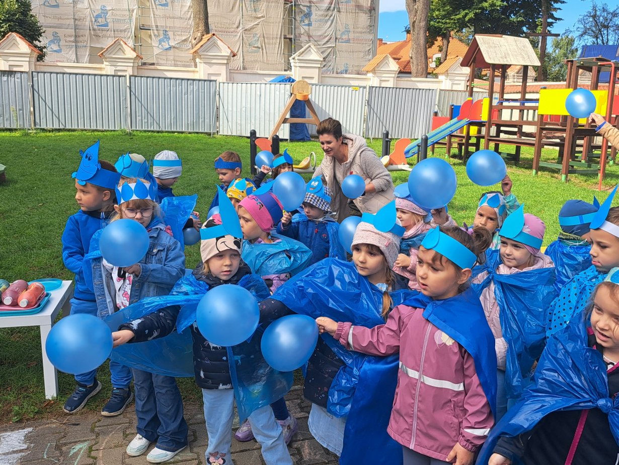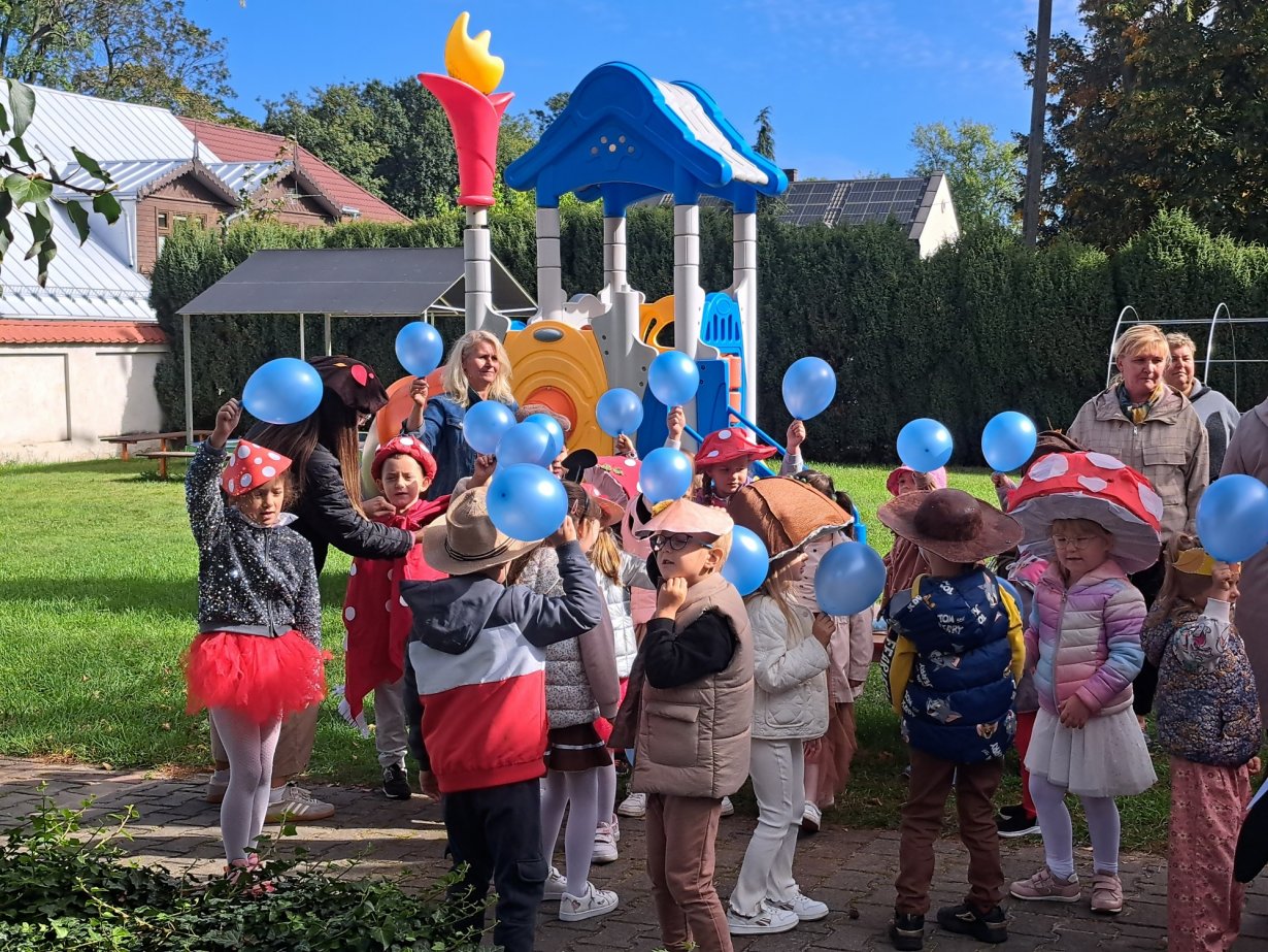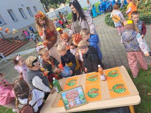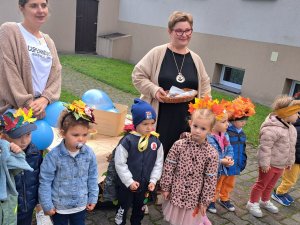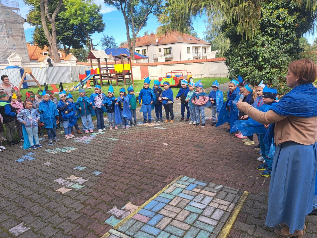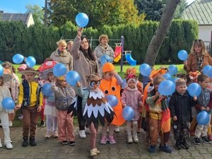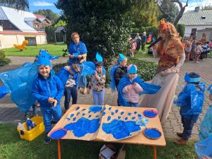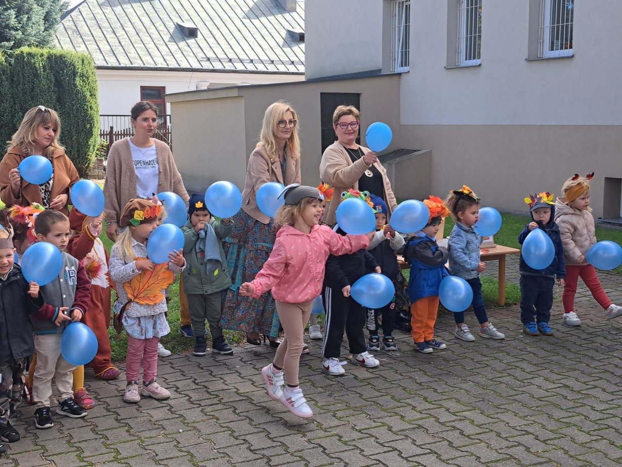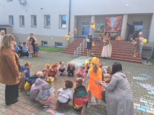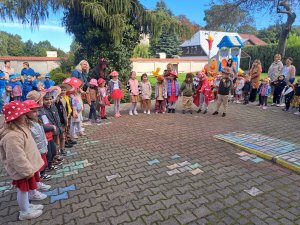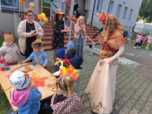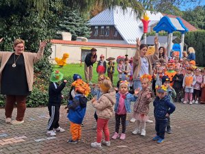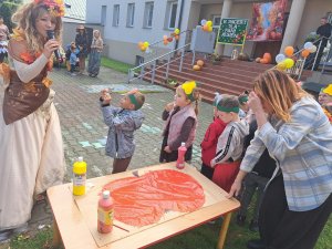 24 września nasze przedszkolaki, ubrane w piękne, kolorowe stroje oficjalnie powitały nową porę roku Jesień przygotowując Koncert dla Pani Jesieni. Każda grupa przygotowała piosenkę o tematyce jesiennej i zaprezentowała się podczas wspólnej zabawy na placu zabaw przed Panią Jesienią. Oprócz występów każdej grupy nie zabrakło wspólnej zabawy przy piosence "Warzywa i owoce" oraz tańcu z balonami do utworu "Kiedy kropla goni kroplę". Dzieci miały również okazję wykazać się umiejętnościami artystycznymi malując farbami obrazy przedstawiające dary jesieni. Pani Jesień przygotowała również dla dzieci śliweczki na poczęstunek oraz jesienne zagadki, z którymi nasze przedszkolaki poradziły sobie z łatwością. Po takim powitaniu z pewnością łatwiej będzie nam się cieszyć urokami nowej pory roku.